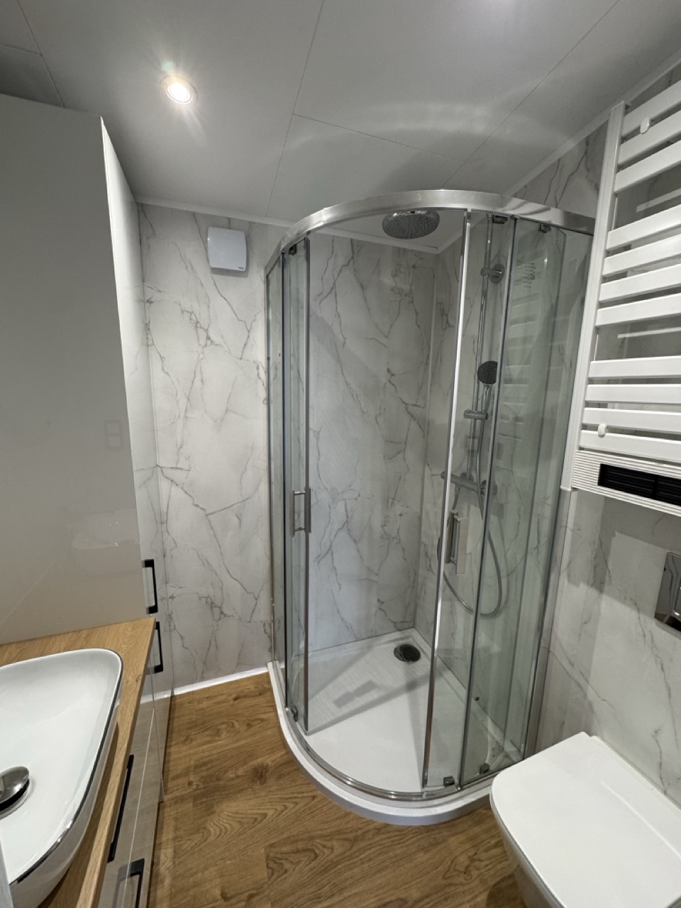 W wariancie "pod klucz" stosujemy m.in. wodoodporne panele ścienne FIBO w łazienkach i sufity Forestia.